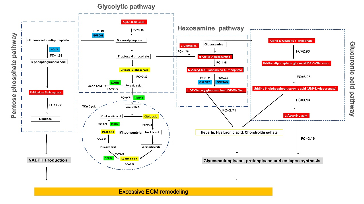 肉鸡胫骨软骨发育不良(Tibial Dyschondroplasia,TD)是快速生长肉鸡的常见多发性骨骼疾病,也是危害肉鸡养殖的重要疾病。该病临床表现为运动障碍、骨骼畸形、生长性能下降、易于发生骨髓炎,屠宰加工中容易骨折导致胴体品质下降。TD的发生严重影响鸡肉品质、造成家禽养殖行业大量经济损失。李家奎教授团队多年来一直专注于肉鸡胫骨软骨发育不良的发病机制解析和药物防治研究,前期相关成果已在《Ecotoxicology and Environmental Safety》《Phytomedicine》和《poultry science》发表。本次研究以AA肉鸡作为研究材料建立福美双诱导的TD模型,对TD肉鸡和健康肉鸡的软骨生长板进行了转录组,蛋白质组和代谢组测序。通过关联分析发现TD发生过程中其生长板软骨细胞糖酵解功能显著下降,细胞外基质ECM合成途径显著增强,此外检测分析发现肉鸡发生TD涉及肠道菌群,胰岛功能和血糖代谢紊乱,且通过体内体外试验证明了肉鸡血糖代谢紊乱是促进软骨细胞ECM过度分泌,导致TD肉鸡胫骨生长板增厚,引起跛行的重要原因。本研究结果为肉鸡TD发生机制提供了新的理论见解,也为TD的防治和治疗提供了新的思路。