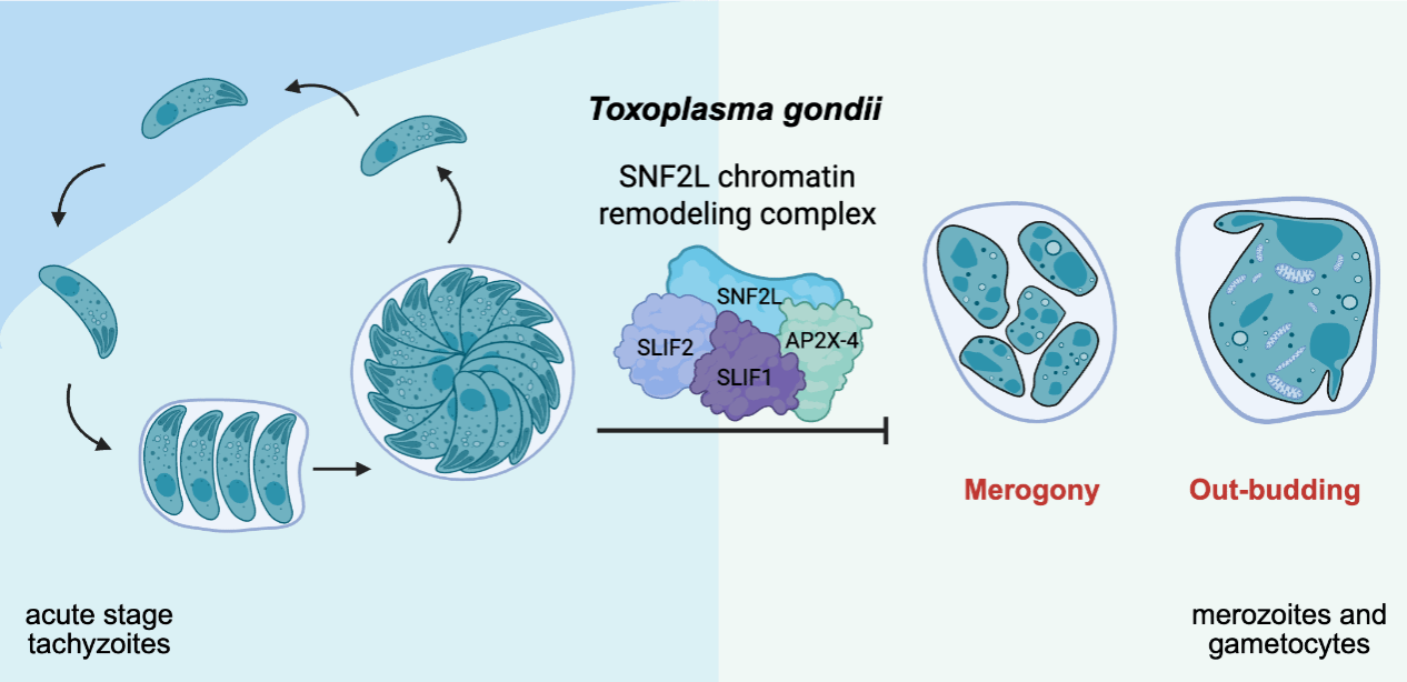 申邦教授团队通过多年的研究,发现一个以SNF2L为核心的弓形虫染色质重塑复合物,包含转录因子AP2X-4以及两个新发现的调控因子SLIF1、SLIF2,它们对发育过程中的基因表达、分裂模式等生命活动有关键调控作用。它们通过动态调节染色质的可及性,协同其它基因调控机制,精确地开启或关闭特定基因程序,从而使虫体的生长发育程序与生活史所处的阶段相匹配。