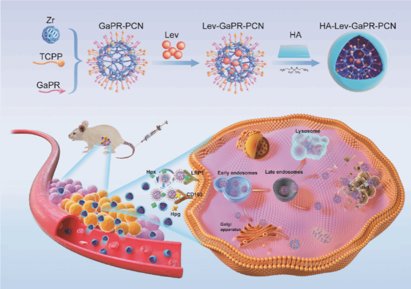 由于MRSA具有胞内寄生和高度耐药的双重特性,传统药物难以有效清除,导致其感染性疾病一直是临床治疗的重大挑战。针对这一治疗难题,团队另辟蹊径,利用金黄色葡萄球菌与宿主的铁元素代谢竞争机制,基于镓卟啉分子陷阱设计了一种新型“特洛马伊”精准纳米递送系统,实现对感染部位、感染细胞和胞内MRSA的三重靶向识别。铁作为血红素的关键组分,对宿主和微生物存活都至关重要。在MRSA感染过程中,感染细胞大量分泌血红素结合蛋白(Hpx)和触珠蛋白(Hpg),与血红素形成稳定复合物后,通过过表达的低密度脂蛋白受体相关蛋白1(LRP1)和CD163受体进行高效内吞,限制MRSA对铁的获取。为应对宿主封锁,MRSA通过激活铁反应性表面决定簇(Isd)系统实现铁的补偿性摄取。基于MRSA和感染细胞对铁元素的双重竞争机制,团队合成了一种对感染部位的分泌蛋白Hpg/Hpx、感染细胞过表达的CD163/LRP1受体以及细菌Isd系统具有三重靶向作用的血红素类似物-镓卟啉(GaPR)。将GaPR与光敏剂TCPP作为有机配体制备成锆基卟啉有机金属框架(GaPR-PCN),利用GaPR-PCN的空隙结构荷载左氧氟沙星(Lev)制备成可同时抑制细菌DNA旋转酶、破坏铁代谢途径和光动力杀伤的多功能精准靶向递送平台。为进一步提升其靶向性和生物相容性,研究团队在Lev-GaPR-PCN表面利用ROS敏感的硫酮连接键(TK)修饰透明质酸(HA),制备成HA-Lev-GaPR-PCN。该系统在血液循环中具有“隐形”特性,在感染部位过表达的ROS或透明质酸酶触发智能释药,暴露Lev-GaPR-PCN的配体GaPR,使其与Hpx/Hpg形成复合物,靶向感染细胞,并逃逸溶酶体和高效锚定胞内MRSA。该递送系统兼具靶向识别感染部位、穿透细胞膜和锚定胞内细菌的能力,并联合左氧氟沙星与光动力疗法,实现三重协同杀菌,显著延缓耐药性的产生。该系统突破了常规抗菌药物难以有效抵达细胞内感染灶的技术瓶颈,为胞内耐药菌的感染治疗提供了创新手段。