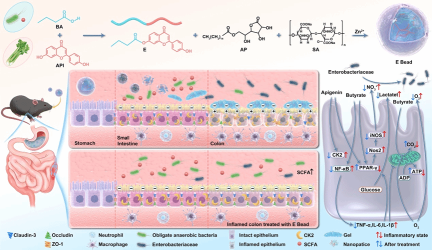 炎症性肠病和腹泻是困扰人类与畜禽健康的常见顽疾,而现有抗生素、糖皮质激素等药物常面临靶向性差、副作用大且易导致肠道菌群失调等瓶颈。团队利用丁酸和天然化合物芹菜素协同抑制丝氨酸/苏氨酸蛋白激酶 (CK2)和阻断p65磷酸化抑制NF-κB炎症通路,激活过氧化物酶体增殖物激活受体γ(PPAR-γ)介导的β-氧化代谢转变,促进专性厌氧菌(拟杆菌门)增殖的同时抑制肠杆菌科(变形菌门)以调控肠道菌群平衡,实现抗炎、肠道菌群调节和肠道屏障修复的三重治疗作用。为克服丁酸难闻臭味和提高两者对肠炎的靶向性,巧妙将丁酸与芹菜素合成为前药“芹菜素丁酸酯”,利用芹菜素与CK2的互作增强对炎症的靶向性。为避免芹菜素丁酸酯在消化道前段的吸收,采用抗坏血酸棕榈酸酯与海藻酸盐制备成胶珠,使其稳定过胃后在回结肠部位崩解为带负电荷的水凝胶(-34.5 mV),经电荷介导黏附至正电荷炎性蛋白聚集的肠炎病灶,并利用炎症部位过表达的酯酶触发凝胶响应性释放和芹菜素丁酸酯的酯解,实现肠炎靶向治疗(图1)。动物试验表明,该胶珠不仅显著恢复炎性肠道的完整性和微生物菌群平衡,还在半剂量、延长给药间隔的条件下,疗效仍优于常规药物,展现出良好的临床转化前景。本研究成果将为炎症性肠病和畜禽腹泻疾病的治疗提供新的策略。