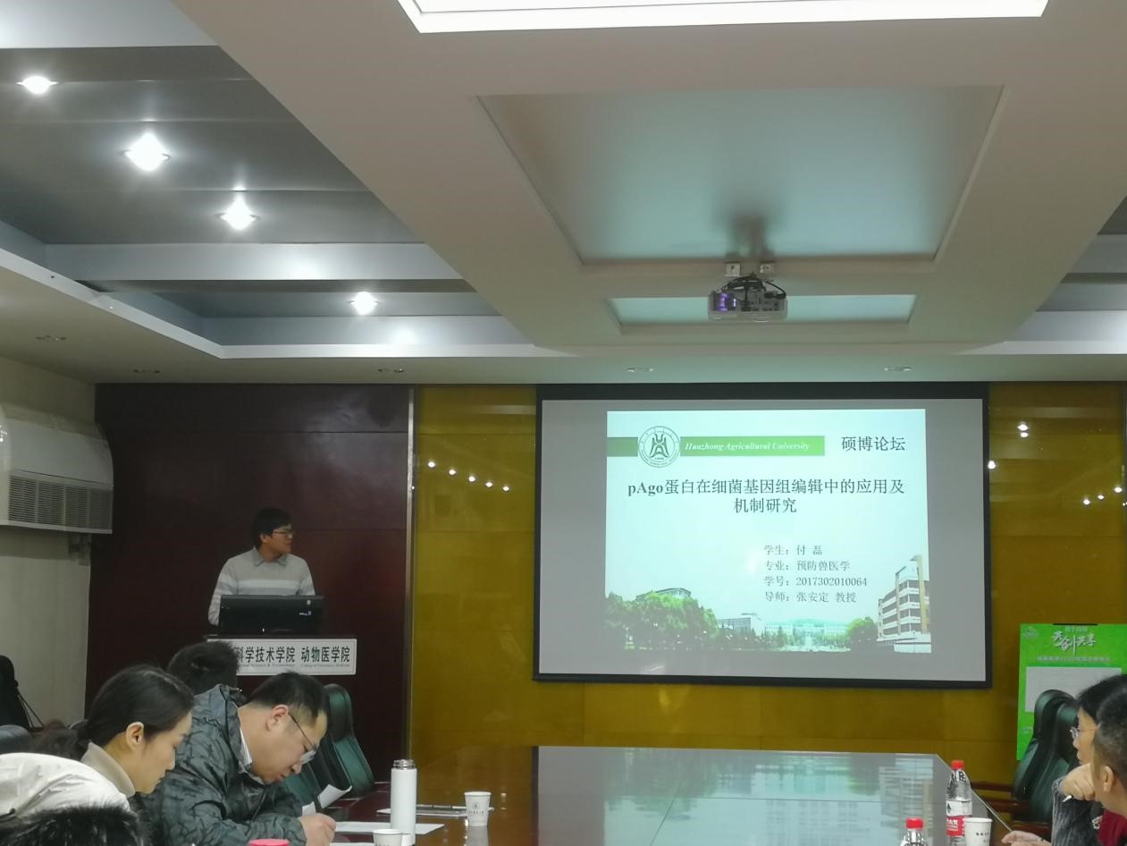 下午2:30分,比赛正式开始。硕士、博士研究生分别在动科楼B105、B517依次进行学术汇报,汇报人围绕各自研究方向讲解了最新的研究进展,为各位师生献上了一场充满激情的学术盛宴。其中,付磊以“pAgo蛋白在细菌基因组编辑中的应用及机制研究”为题,讲解了如何利用原核Ago蛋白开发一种新型、简便、高效的动物病原菌遗传操作工具,该技术创新之处在于用pAgo蛋白能高效地实现细菌基因编辑,没有脱靶现象及种属特异性。当被评委专家问到怎样想到利用ngago技术来开展实验,付磊表示,他们尝试了很多方法,都未能实现在巴氏杆菌基因编辑,当时韩春雨报道在真核细胞上ngago能实现基因编辑,所以他们尝试在原核细胞进行编辑,最终取得了突破;梁笑寒以“The apicoplast localized pyruvate dehydrogenase complex in Toxoplasma gondii is important for fatty acid synthesis but dispensable for parasite virulence”为题,结合反向遗传学及代谢组学的手段证明了弓形虫中丙酮酸脱氢酶的生物学功能及其意义,讲述了在弓形虫中所特有的脂肪酸合成二型途径。此次活动也吸引了诸多留学生参与,留学生的加入让本次硕博学术论坛内容更加丰富,汇报主题也包含本学科的一些前沿专题。其中,Doaa Higazy围绕流感病毒为我们带来一场精彩绝伦的学术汇报。最后,评委老师根据参赛选手的汇报内容进行提问,与选手展开经验交流,并综合多方面进行点评打分。比赛结束,彭克美老师对本次活动进行总结发言,他鼓励更多学生在开展科研的同时,也应积极参与学术活动来丰富自己的学习生涯。