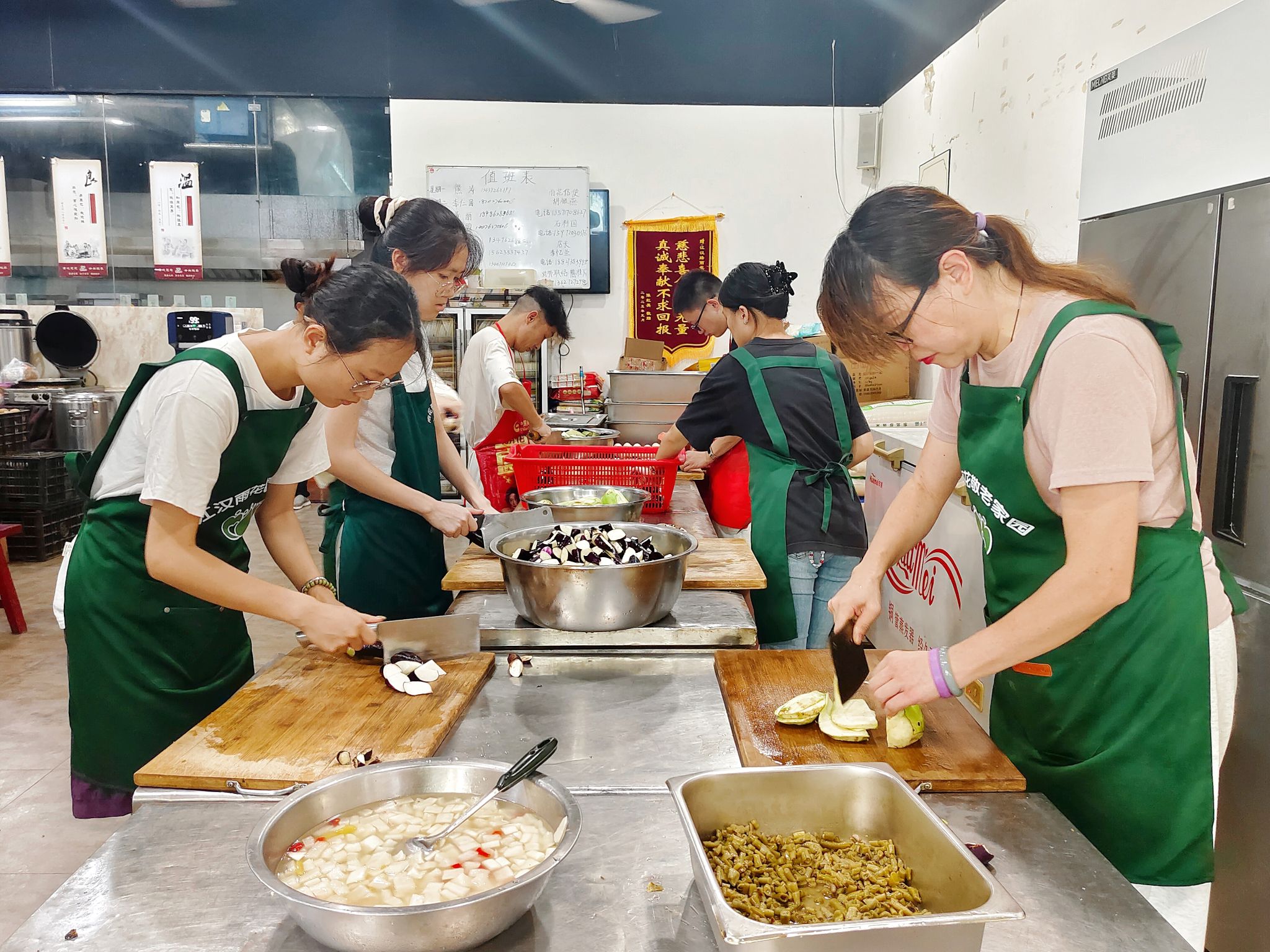 雨花斋是一家成立于2015年的公益素食餐厅,致力于为社区老人提供免费午餐,传播互助与关爱的理念。实践期间,团队成员每天清晨抵达服务中心,迅速投入备菜、切菜、洗碗等工作。从最初的生疏到逐渐熟练,队员们用细致的劳动为老人们准备营养可口的餐食。切土豆、摘韭黄、洗餐具……每一项任务都凝聚着团队成员对公益事业的热忱。