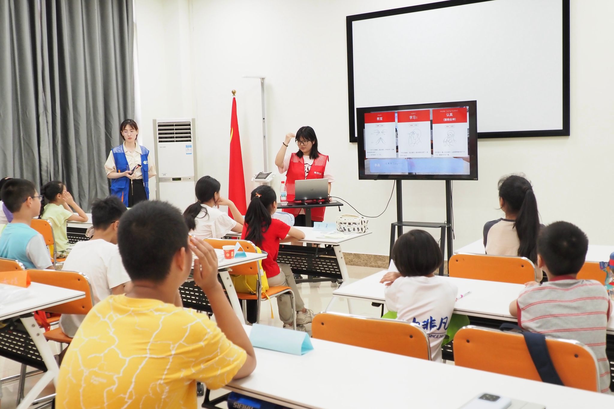 实践团成员耿晨组织孩子们有序入座后,成员陈梦伊开启手语课堂。课堂以“模拟听障人士的一天”为背景,融入日常问候、数字表达等基础手语,通过图片展示、动作示范、互动模仿等方式,讲解手语的基本手势与表达逻辑。陈梦伊演示“学习”“专注”的手势时提到:“手语不仅是听障人士的交流工具,更是传递温暖与尊重的方式。”孩子们纷纷举小手模仿,课堂上满是专注的眼神与整齐的动作。