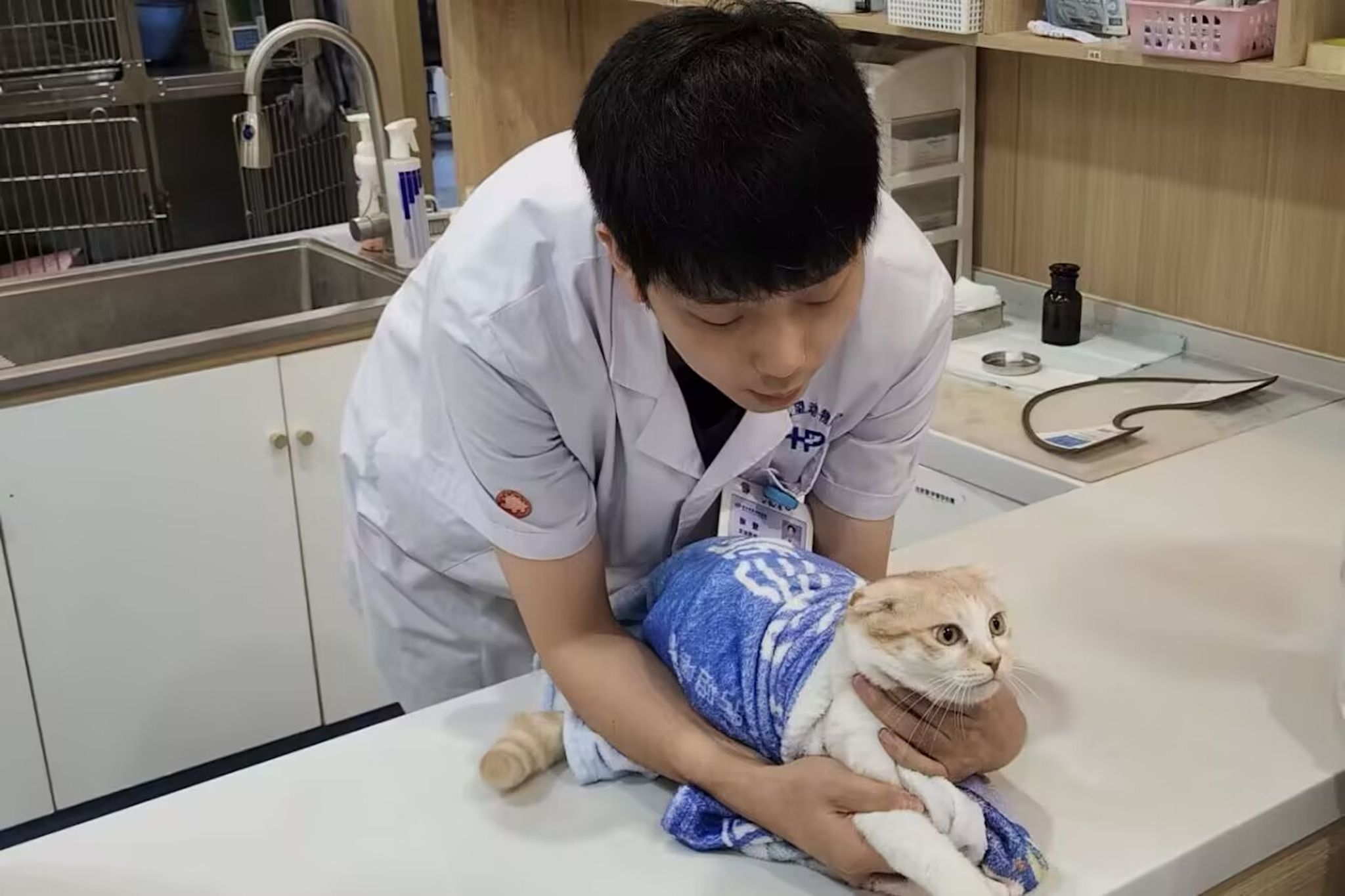 活动尾声,张登传授毛巾裹法保定技巧。他一边用毛巾熟练包裹小猫,一边耐心讲解:“包猫力度要适中,让小猫有安全感又不被压迫。用毛巾或专用包猫布,轻轻包裹小猫身体并露出头部,既方便后续操作,也能有效保护小猫。”