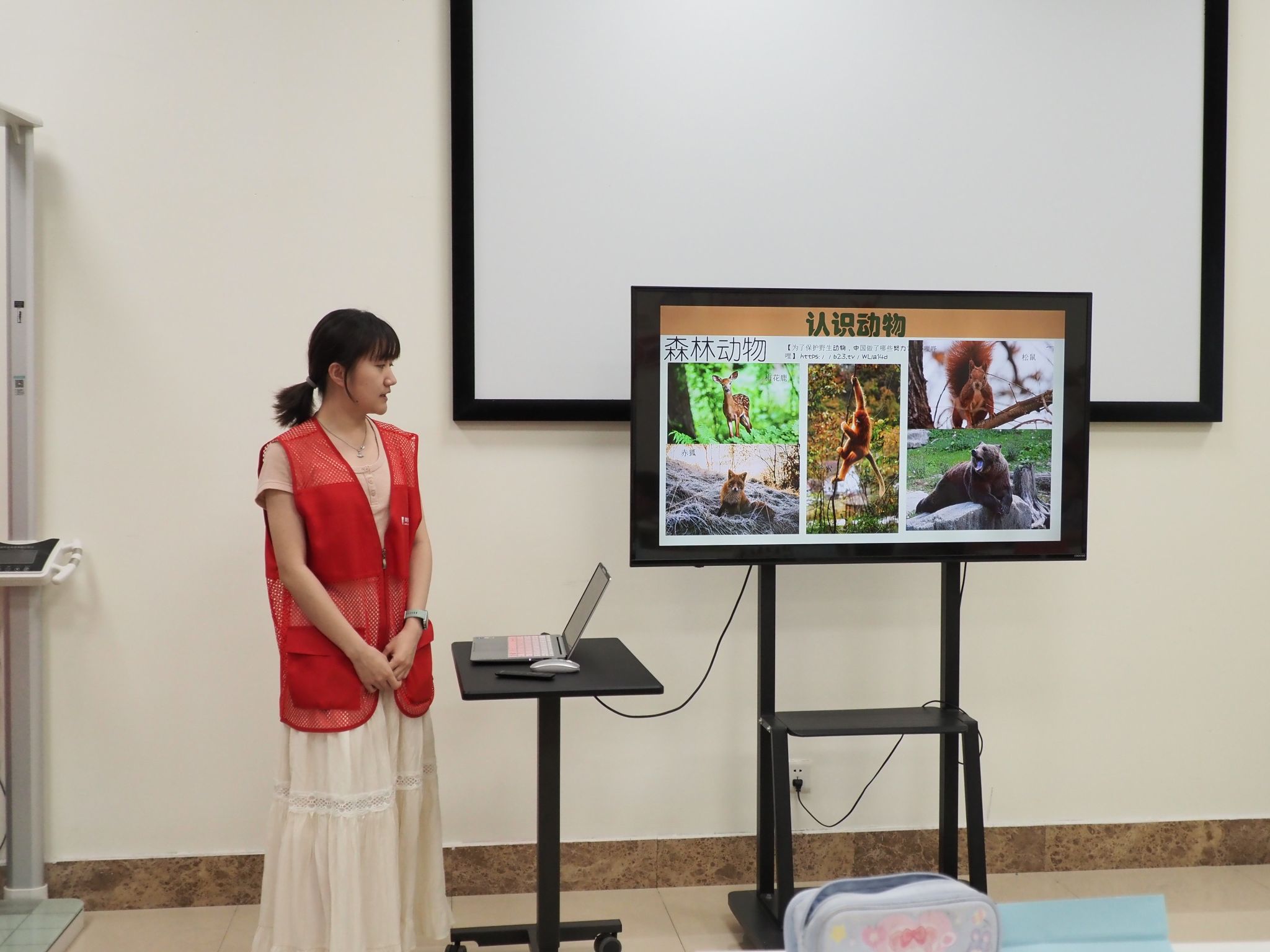 活动伊始,实践团成员李雅萍通过一段生动的动物视频,为小朋友们开启了动物世界探索之旅。课堂以森林动物为主题切入,先是介绍了棕熊、梅花鹿和大熊猫等常见物种,迅速调动了孩子们的学习兴趣与参与热情。随后,课程内容拓展至城市中常见的小动物,科普了流浪猫绝育的重要性,并介绍了麻雀、灰喜鹊等鸟类的生活习性,引导孩子们关注身边的动物伙伴。