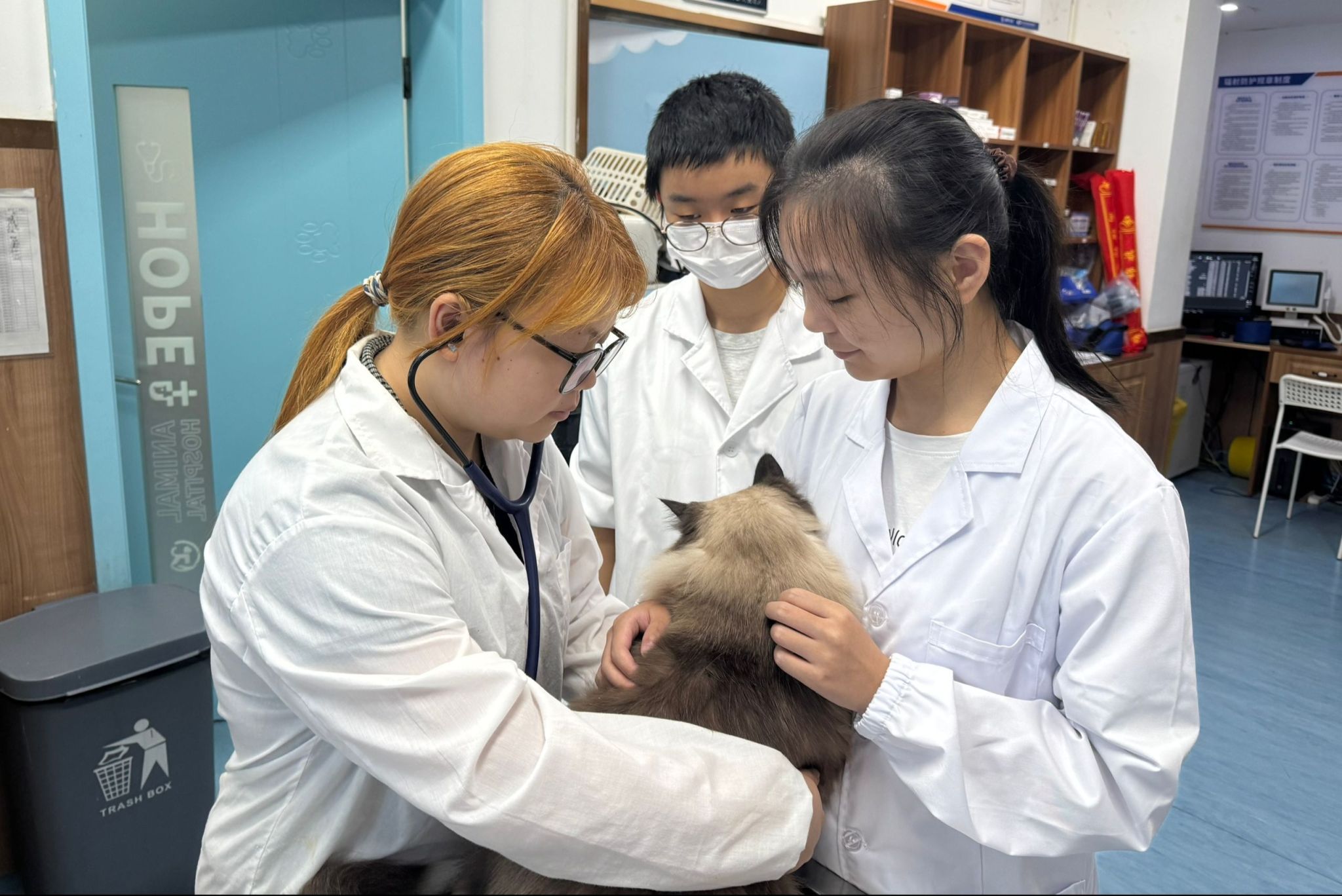 动物保定与心跳听诊实操环节,由该院主任医师周家宇进行技术示范与指导。团队成员轮流使用听诊器,在院猫“Bling”体表第四肋骨附近清晰辨识其心音。交流中,周家宇提醒:“现阶段是同学们理论学习的重要时期,但也不能轻视实践的重要性。同学们可以主动去临床前线累计经验,为未来道路打下更坚实的基础。”