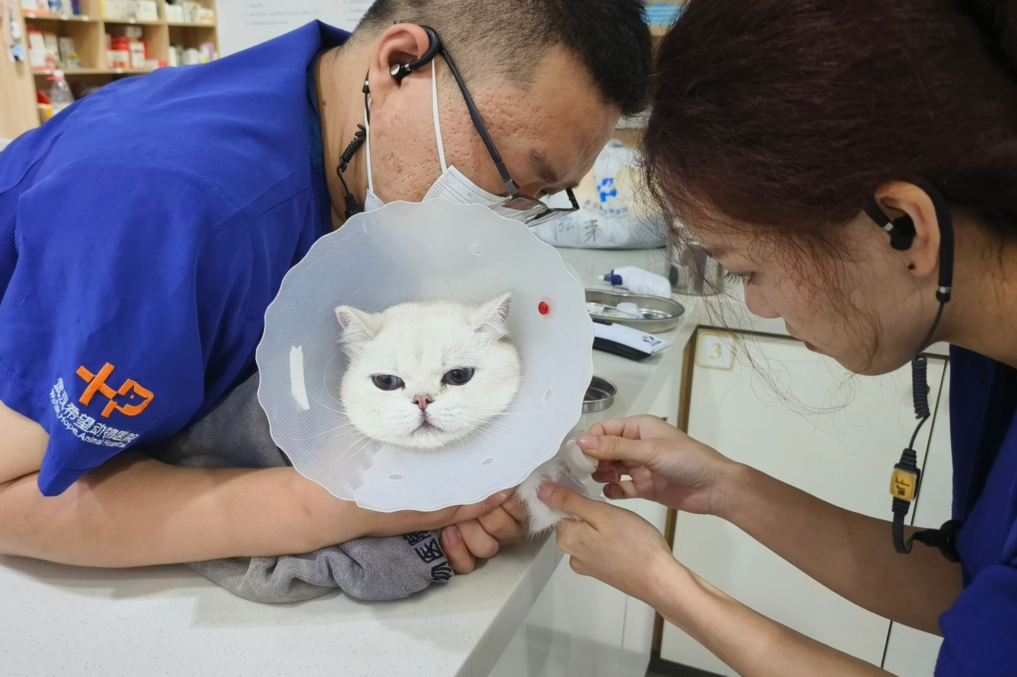 随后,医生示范了静脉注射技巧:左手捏起猫咪前肢暴露血管,右手持针以合适角度快速刺入,平稳推注药液。医生讲解道,精准控制进针角度、深度和速度对减轻动物应激反应至关重要。团队成员专注观察全程,记录操作要点,将课堂理论知识与实际操作进行对照学习。