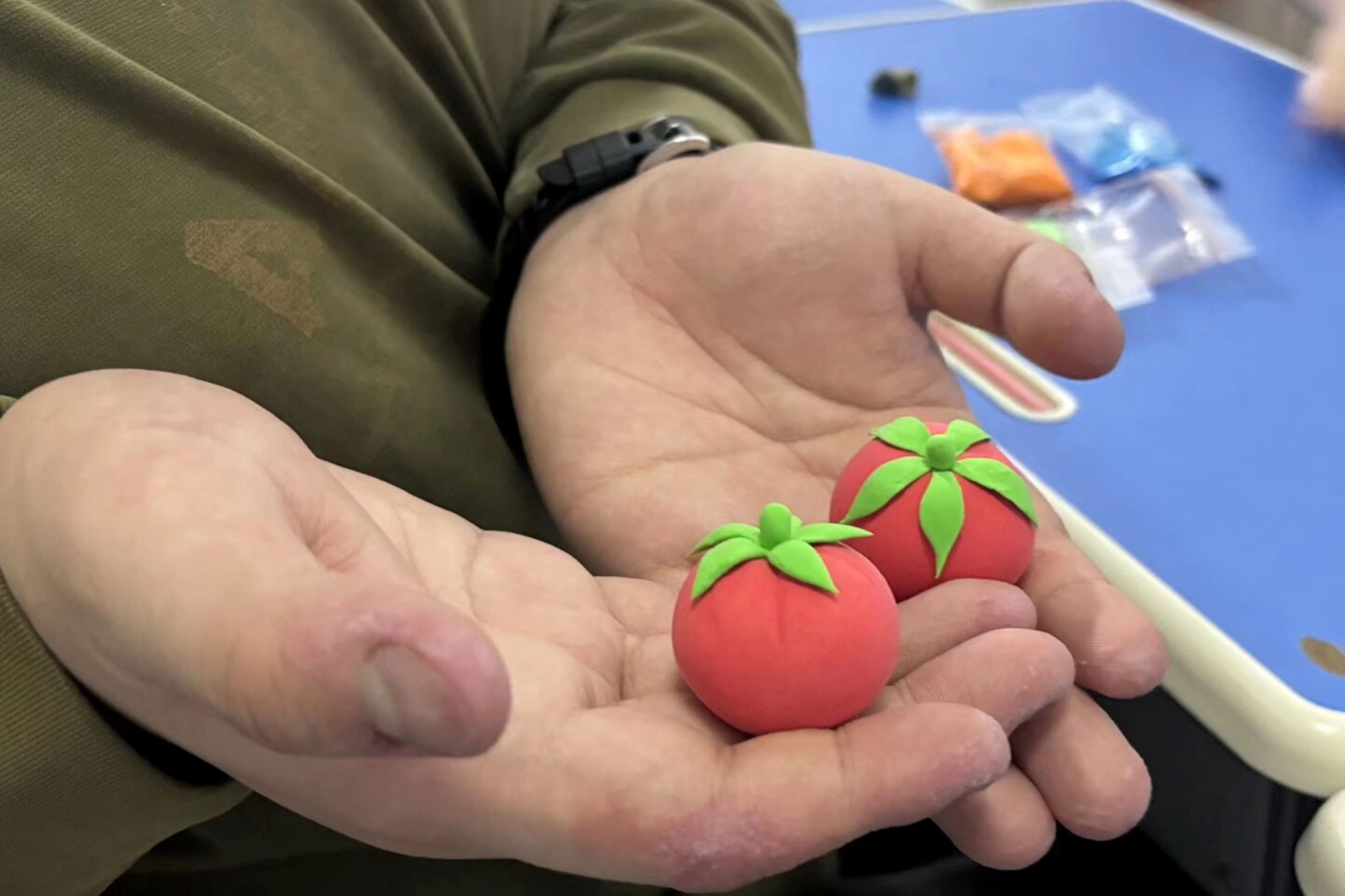 下午,实践团组织超轻黏土手工活动。志愿者与小朋友结成“创作搭档”,在捏塑过程中细致观察其行为特点:有的孩子对色彩表现出敏感,有的则偏好结构搭建。在引导互动中,团队成员与孩子们逐步建立起信任纽带。一名志愿者在记录中写道:“当孩子主动将捏好的小番茄递到我手中时,那种被需要的感觉胜过千言万语。”