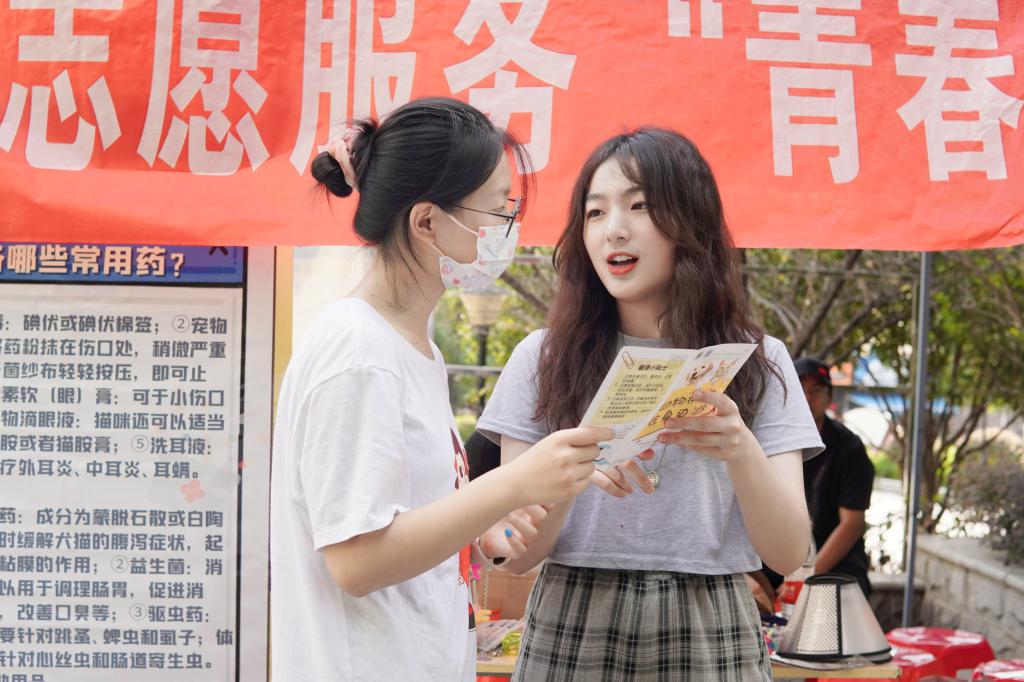 志愿者共分为两组,一组在摊位进行定点宣传,另一组则向周边的居民分发科学养宠知识手册。在陈建国的指导下,志愿者从饮食健康和营养、日常护理、疫苗接种等方面向居民讲述养宠的注意事项,并详细讲解了人畜共患病的相关知识。在宣传过程中,志愿者逐条记录居民提出的养宠问题并进行整理。
