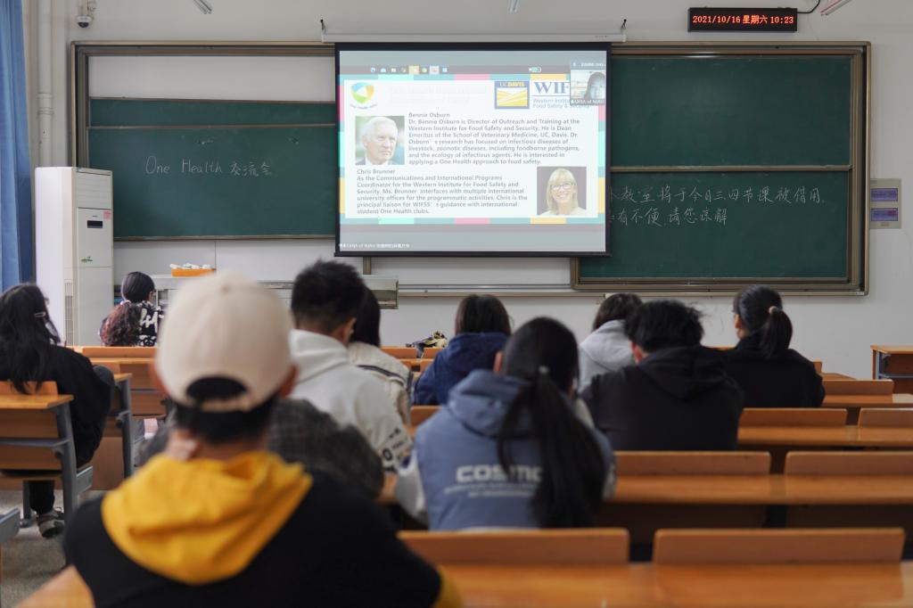 “‘One health’即全球健康,指的是结合多学科知识解决地区间、国家间及全球的健康,提升人、动物和环境的健康水平。”张雅婷率先对“One health”的概念进行初步解释。她通过举例追溯新冠病毒的来源,生动形象地解释了“One health”的核心内容:“‘One health’强调结合多学科知识解决问题,在解决过程中追踪到引发问题的源头,从源头着手解决。”南京农业大学于2014年1月,同加州大学戴维斯分校签署了共建南京农业大学-加州戴维斯万物健康联合中心(NUA-UCDavis One Health Joint Center)框架协议。张雅婷指出:在此合作框架下,One Health International Association of NAU成立,并致力于推广和分享关于“One health”的资讯,将理念付诸实践。她提及了社团会举办各项相关活动,这些活动能够帮助学生有机会与国内外高校教授面对面交流,增进专业知识水平,拓展全球视野。