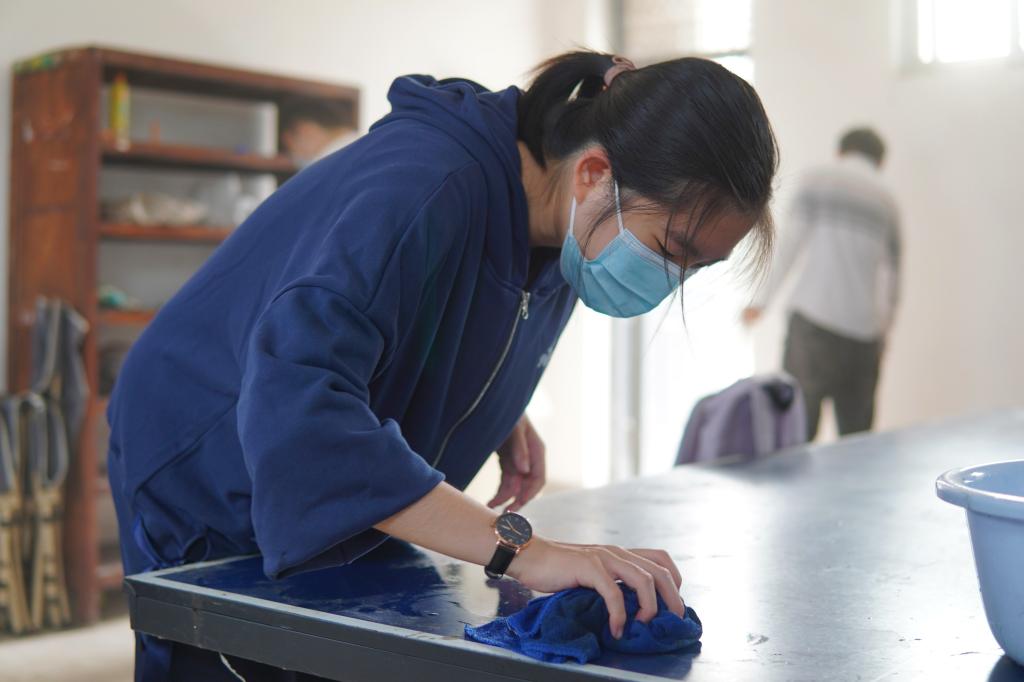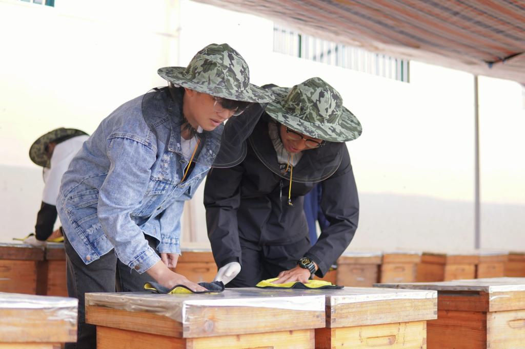 讲解过后,黄兆新在介绍本次打扫蜂场的任务后进行任务分配。志愿者们分为三组,分别负责擦拭蜂箱、除去蜂箱周围的杂草和清扫垃圾。他们分工明确,配合默契,以较高的效率完成了清扫活动。志愿者杨佳渝微笑着说:“尽管有些害怕蜜蜂,但是劳动的意义让我能够战胜恐惧。”