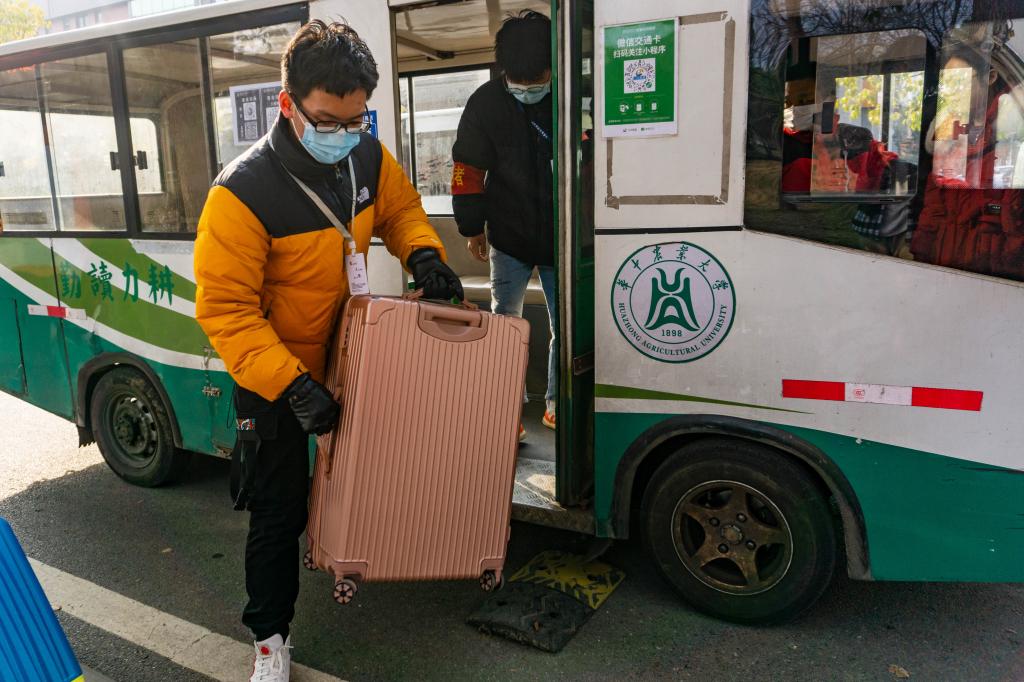 “请同学们切换行程码、返校单、核酸检测证明,另外中高风险地区的同学请暂不返汉。”2月20日下午3时许,伴随着广播声,西大门入口处返校学生陡增。437437必赢国际网址志愿者严格依照常态化疫情防控要求,引导返校学子进入正确通道,接过他们手中的大件行李,送上校园摆渡车,在返校高峰期工作依然有条不紊。