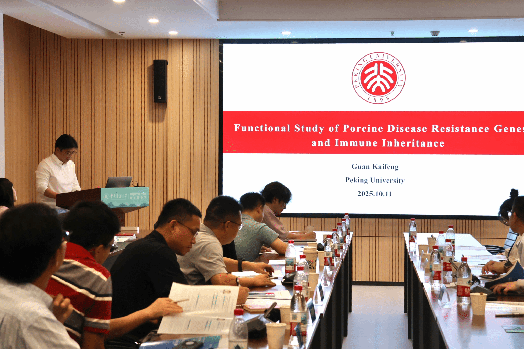 武汉大学博士后韩春燕以“卡波氏肉瘤相关疱疹病毒与宿主限制因子的分子博弈”为题展开报告;美国天主教大学噬菌体医学研究中心研究助理教授朱金根在本次报告中介绍了T4噬菌体工程平台在长片段基因递送和黏膜免疫方面的最新进展。他创建了T4人工病毒载体,突破了传统载体的容量限制以及真核细胞递送屏障,实现了长片段基因的高速、长效递送;武汉大学助理研究员、博士后佟晓晗的汇报主题为“基于CRISPR系统的病原体快速检测新方法”。团队围绕CRISPR系统在分子检测平台中的应用展开,构建一种高效、高灵敏度的CRISPR-based分子检测系统,以克服现有核酸检测方法难以满足现场快速诊断的常见问题——操作流程复杂、处理时间长、依赖专业设备等;香港大学博士后隋保坤以“狂犬病病毒与宿主间的‘博弈’”为题展开报告,团队研究发现宿主神经系统中存在LncRNA EDAL、PCP4L1、TRIM72和RTP4等多种宿主因子,可显著抑制狂犬病病毒的增殖,并揭示了街毒株狂犬病病毒M蛋白直接与NLRP3相互作用,抑制NLRP3炎症小体激活以逃避外周炎症反应的详细分子机制;香港大学博士后邹佳辉围绕“猪流感病毒复制必需宿主因子的筛选与机制研究”展开汇报。研究借助猪的全基因组CRISPR-Cas9敲除文库筛选,鉴定出了宿主因子GGCX和RBM6对欧亚禽样H1N1猪流感病毒(EA H1N1 SIV)的复制具有关键作用;北京大学博士后官凯锋以“猪抗病基因的功能研究与免疫传承”为题展开汇报。我院基础兽医学系教授Daisuke Takao进行了题为“细胞结构的高内涵成像用于解析肌肉发生机制及肉类生产力”的报告,分享了高内涵成像与定量表型分析的最新进展。